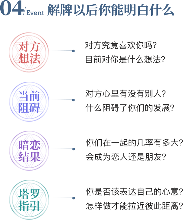 暗恋总是患得患失,占卜结果说我还不能操之过急,因为勉强为之反而会适得其反,果然我调整了一下心态,很多事都变得顺利了。
